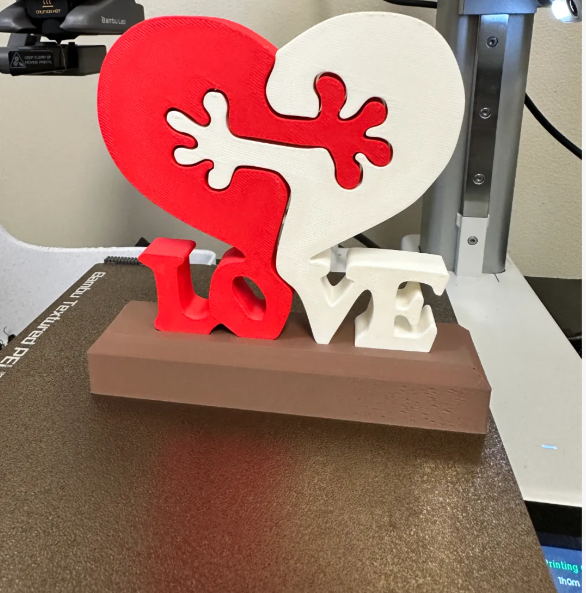 Uma escultura de mesa 3D vibrante e simbólica, perfeita para decorar qualquer ambiente com um toque de amor e criatividade. Este item é composto por duas peças principais que se encaixam como um quebra-cabeça: um coração vermelho e uma parte branca com a silhueta de uma salamandra, que se unem para formar um coração completo. A base da escultura é um bloco marrom sobre o qual as letras “LOVE” são dispostas de forma tridimensional, com “LO” em vermelho e “VE” em branco. A peça é leve e feita com tecnologia de impressão 3D, garantindo detalhes precisos e um acabamento liso. Ideal para presentear em datas especiais como Dia dos Namorados, aniversários de relacionamento ou simplesmente para expressar carinho.