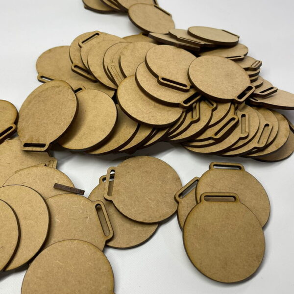 + Free ShippingKit com 20 bases redondas em MDF cru (5cm de diâmetro, 3mm de espessura) com abertura para fita de 2cm, prontas para serem transformadas em medalhas personalizadas.
