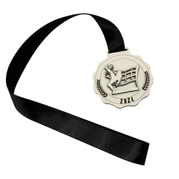 Descrição completa Medalha de premiação em formato circular com borda ondulada, feita em material leve (MDF ou madeira gravada a laser), com um acabamento em cor clara. O design apresenta um atleta em pleno movimento, executando um golpe no ar em direção a uma bola, com uma rede de vôlei ao fundo. Na parte inferior, está gravado o ano “2024”. As laterais do desenho central são adornadas com ramos de louro em gravado a laser. A medalha possui um orifício superior para a passagem da fita. É ideal para torneios e campeonatos de vôlei de praia, futevôlei ou esportes de areia.
